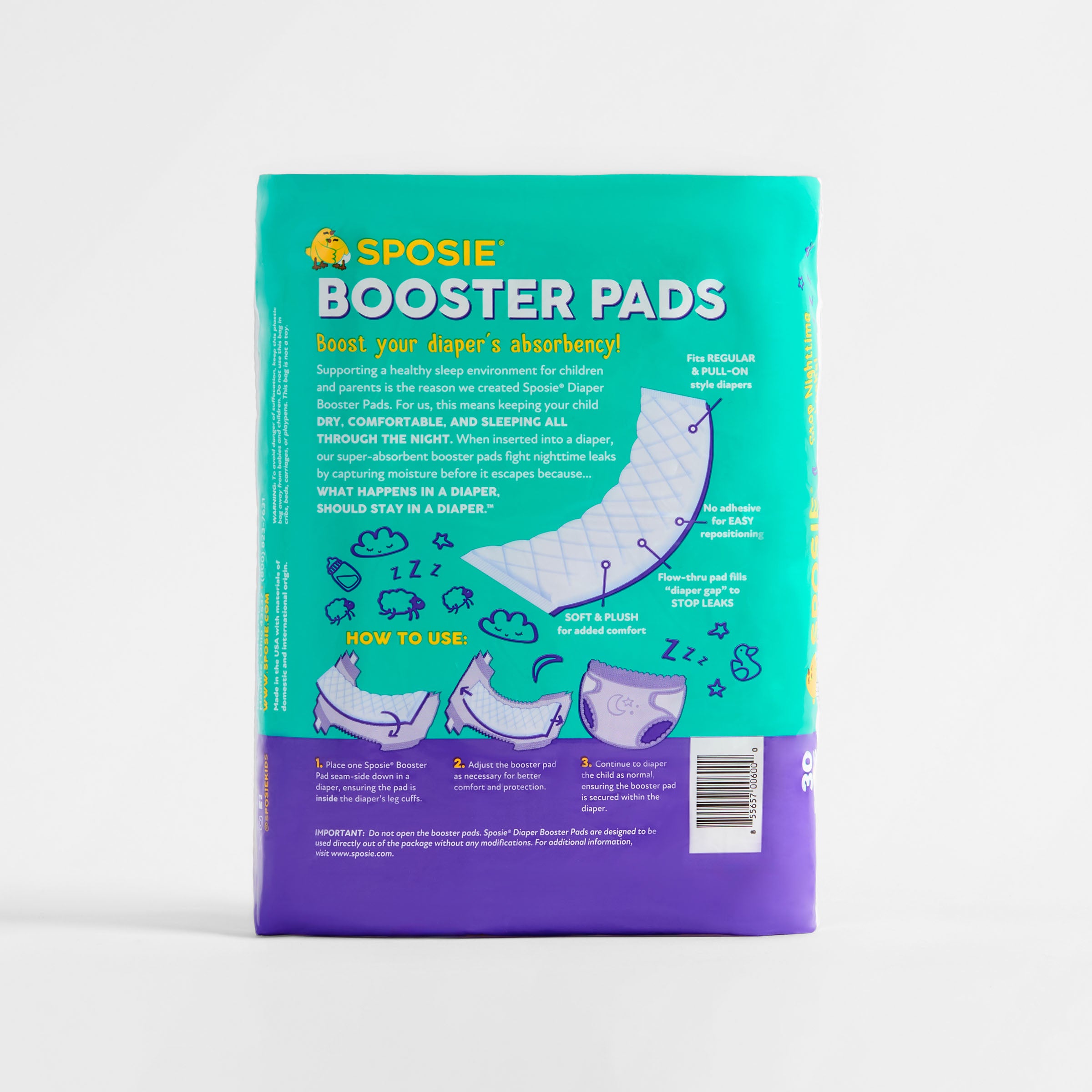 Stop nighttime leaks! No Mess. No Stress. Sposie Diaper Booster Pads (AKA Diaper Doublers) are super-soft and super-absorbent pads you insert inside any diaper to instantly transform it into the ultimate overnight diaper.